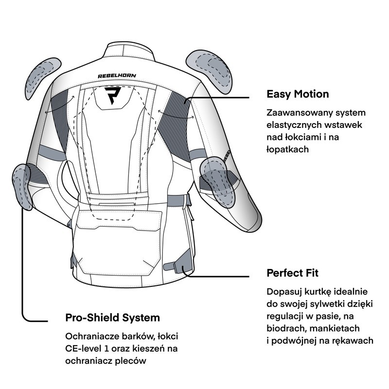 O Twoje bezpieczeństwo dbają: komplet ochraniaczy (barki, łokcie, plecy), odblaskowe wstawki i wymienne panele fluo oraz wzmocnienia stref newralgicznych z materiału Hitena® Dobby Ballistic.