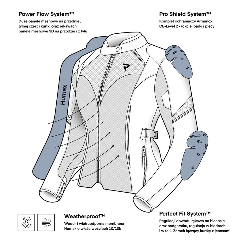 Kurtka JAX LADY jest wyposażona w zestaw ochraniaczy Armanox CE-level 2, w tym ochraniacz pleców. Spełnia wymogi drugiego poziomu ochrony, który obejmuje całą kurtkę (AA).