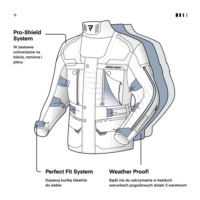 O Twoje bezpieczeństwo dbają ochraniacze łokci i barków, odblaskowe wstawki oraz wzmocnienia stref newralgicznych z materiału Poliester Dobby Ballistic.