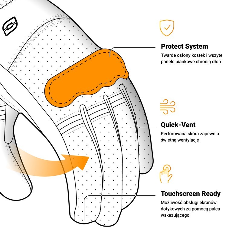 Motocyklowe rękawice z koziej skóry z oddychającą wyściółką i poliestrową podszewką. Mają perforację na zewnątrz dłoni i twardą osłonę kostek. Wnętrze z potrójnego materiału. Dopasujesz je idealnie dzięki elastycznym elementom i anatomicznej konstrukcji. MATERIAŁ