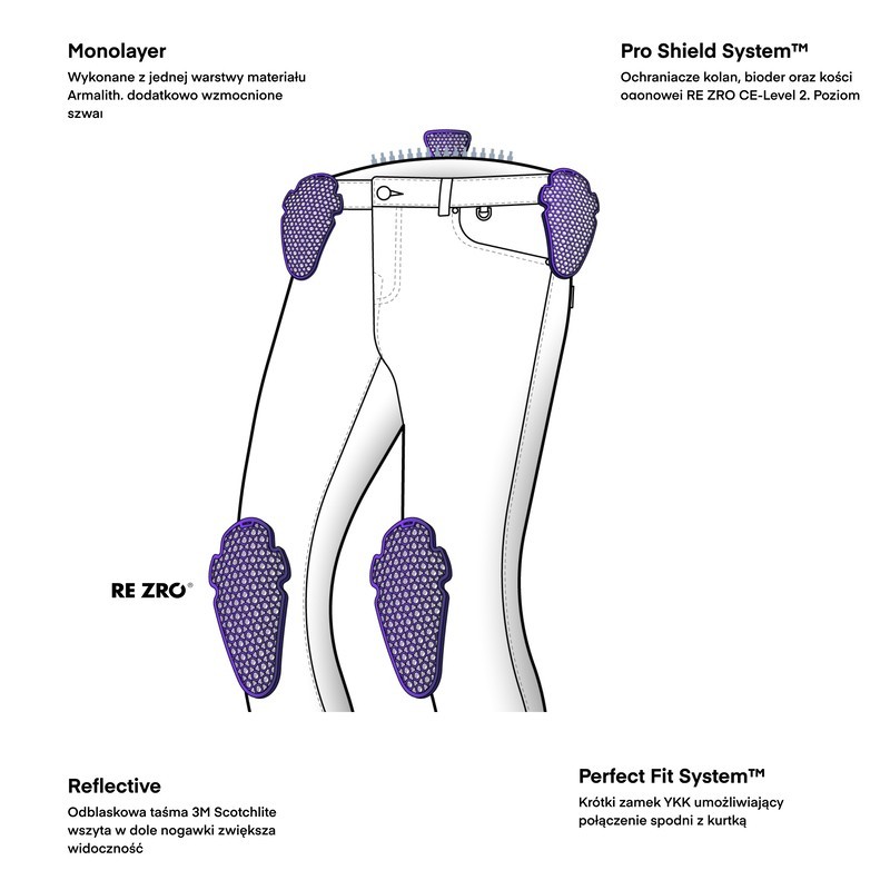 Jeansy Rebelhorn Bronco oferują wysoką ochronę dzięki ochraniaczom bioder, kości ogonowej i kolan (z regulacją położenia). Ochraniacze RE ZRO® są lekkie i elastyczne, co zwiększa komfort użytkowania.