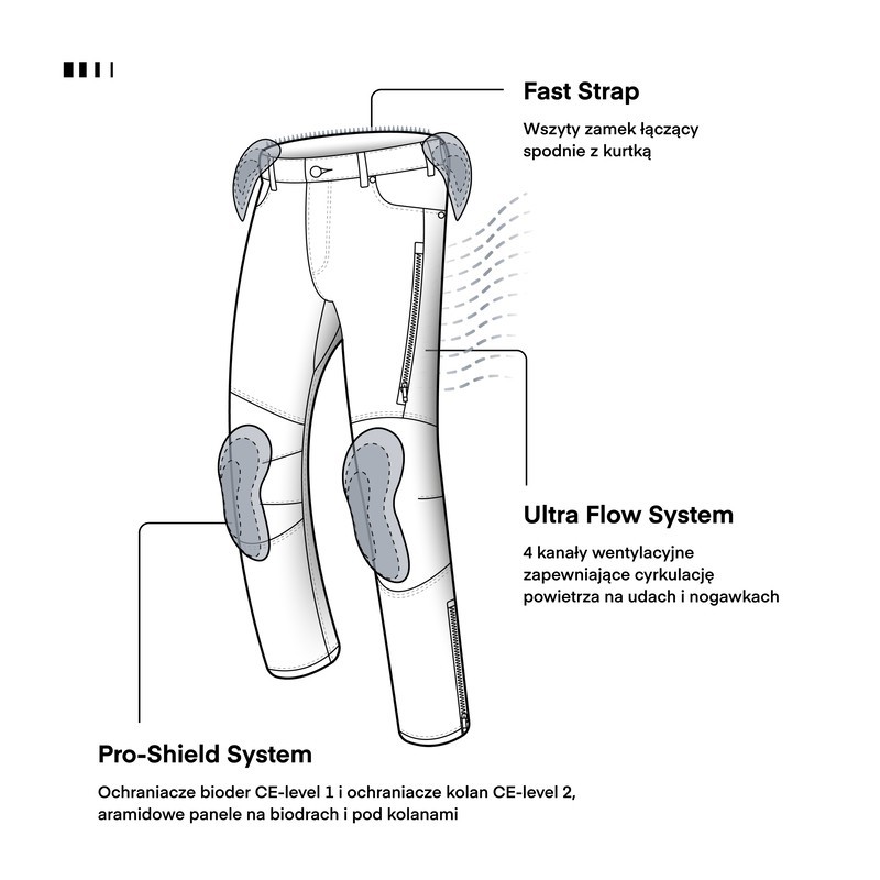 O Twoje bezpieczeństwo dbają: ochraniacze SAS-TEC® (biodra, kolana) oraz panele na kolanach, biodrach i w pasie wykonane z wytrzymałego aramidu.