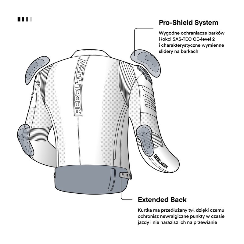 Kurtka wyposażona jest w ochraniacze SAS-TEC® poziomu 2 na łokciach i barkach. Można ją opcjonalnie doposażyć w ochraniacz pleców. Lekko przedłużony tył chroni okolicę lędźwiową.