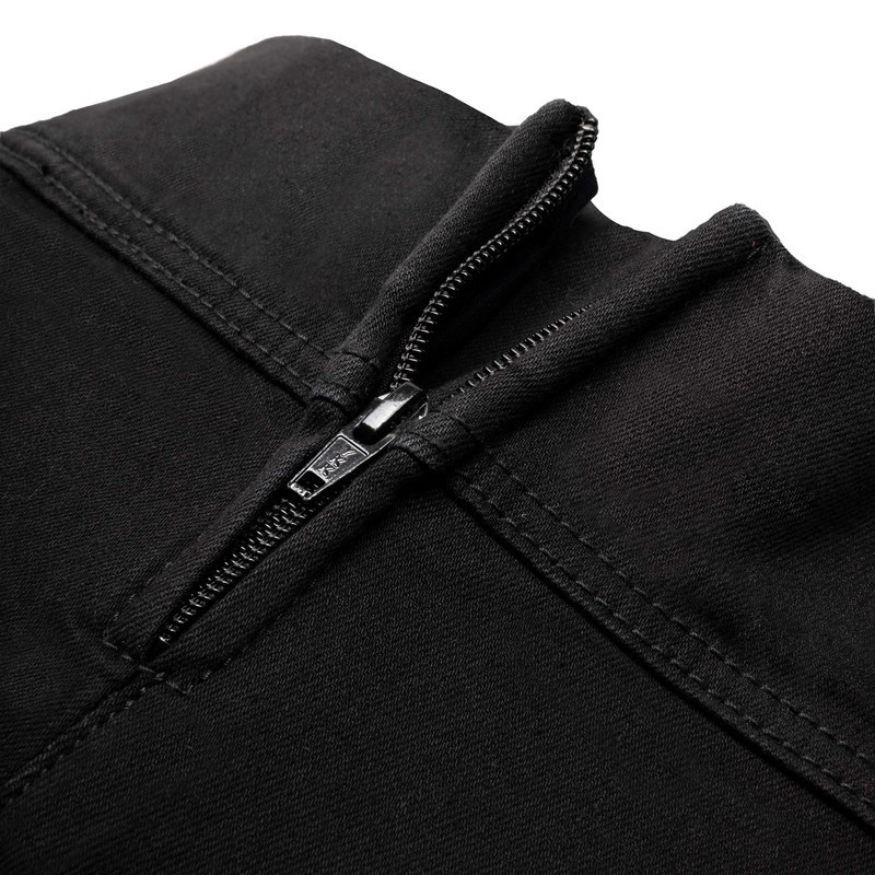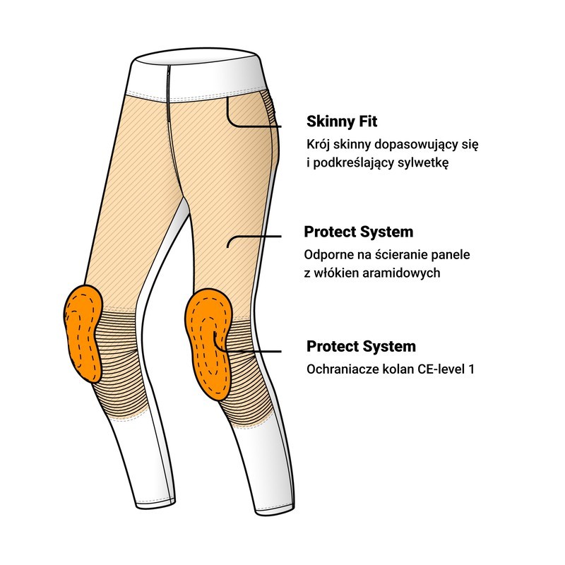 • Elastyczne i odporne na ścieranie panele z włókien aramidowych wszyte wewnątrz na kolanach, biodrach i pośladkach ochraniające duży obszar ciała