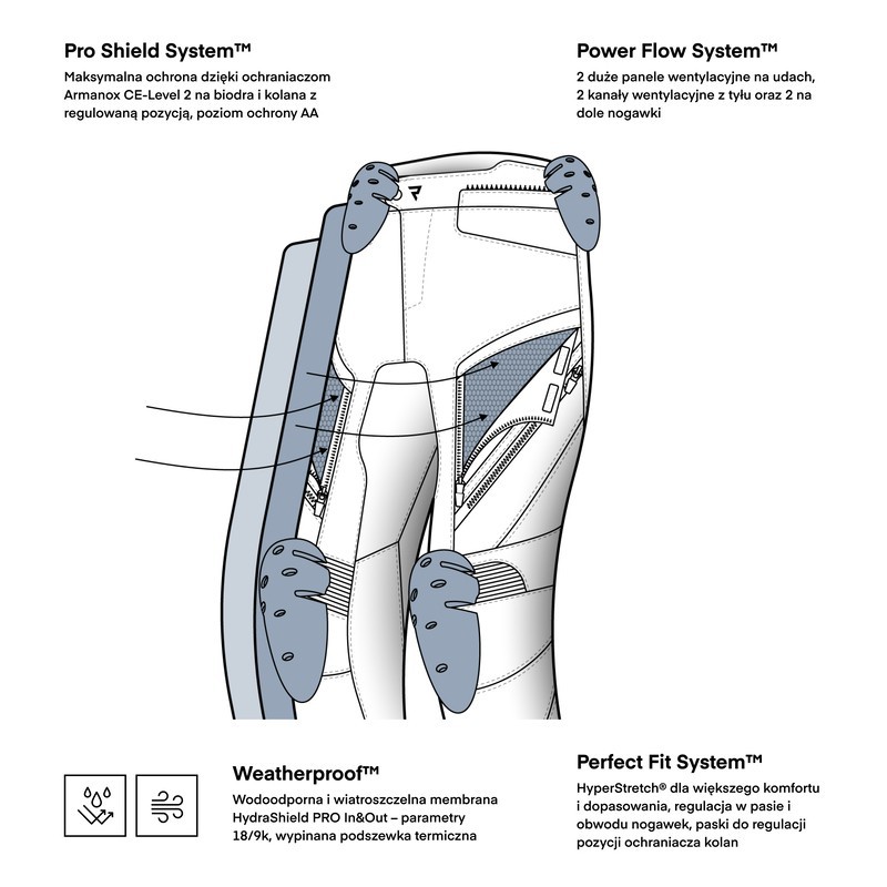 Dzięki wypinanej membranie HydraShield™ PRO in&out oraz ocieplinie, Hardy 3.0 sprawdzą się zarówno w deszczowych, jak i chłodniejszych dniach. Idealnie współgrają z kurtką Hardy 3.0, tworząc kompletny zestaw dla wymagających motocyklistów.