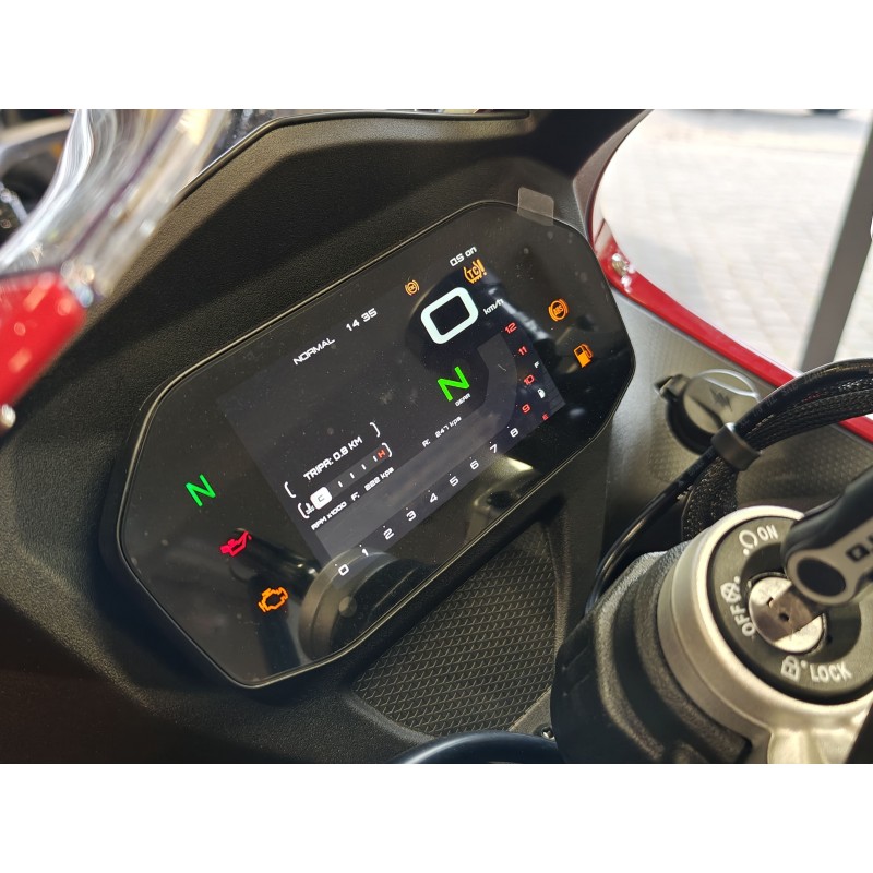 Duży, kolorowy wyświetlacz TFT prezentuje wszystkie kluczowe informacje w sposób czytelny zarówno w dzień, jak i w nocy. Panel umożliwia dostosowanie osiągów motocykla oraz połączenie z telefonem, wyświetlanie nawigacji z aktualnym ruchem drogowym, a także udostępnienie ekranu smartfona. Można na nim również zarządzać połączeniami przychodzącymi. Dodatkowo, tuż obok znajduje się port USB do ładowania urządzeń, co zapewnia wygodę w każdej podróży.