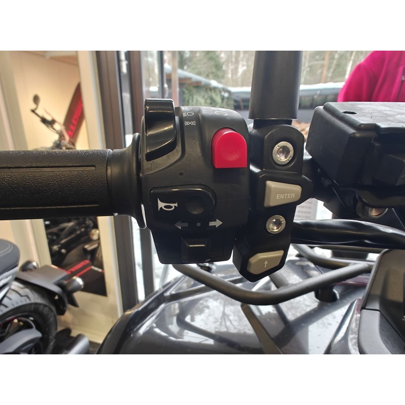 SFA300 ma hamulec ręczny na prawej stronie kierownicy oraz przełącznik do obsługi ekranu TFT po lewej.